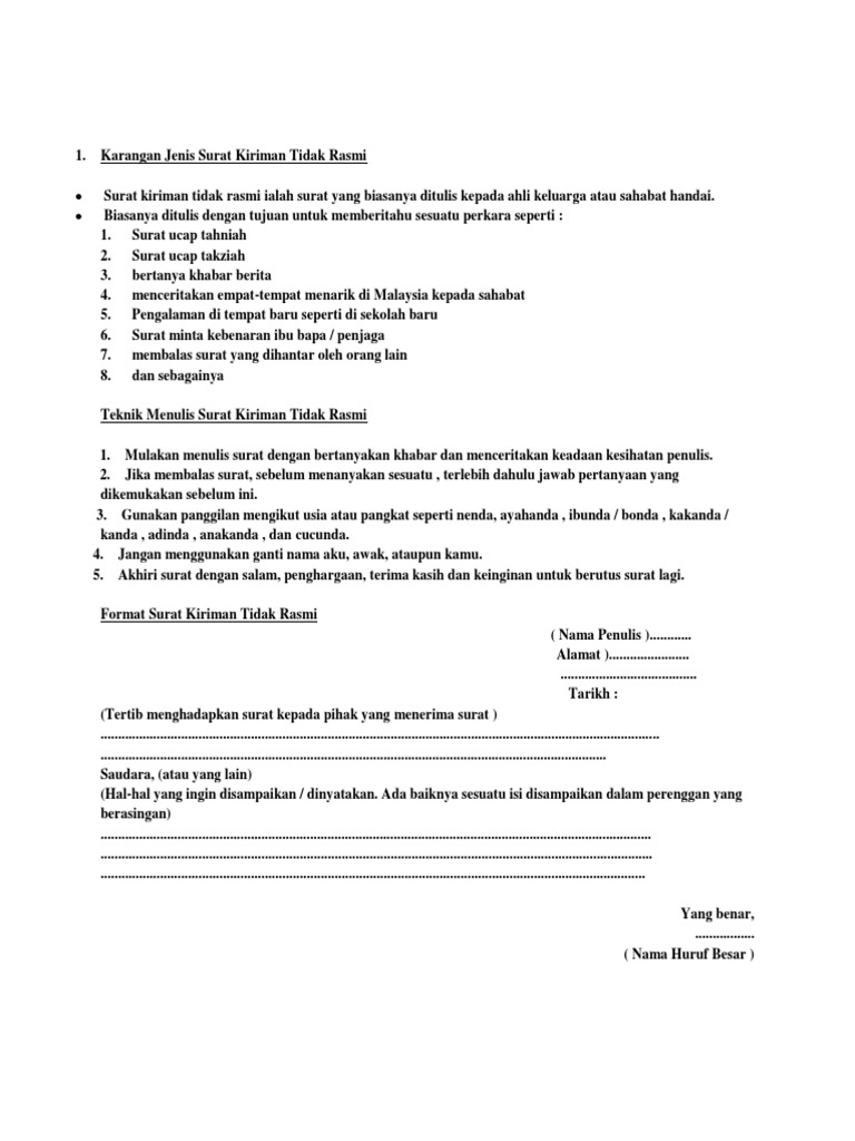 Contoh Surat Kiriman Tidak Rasmi Bm Thn 5