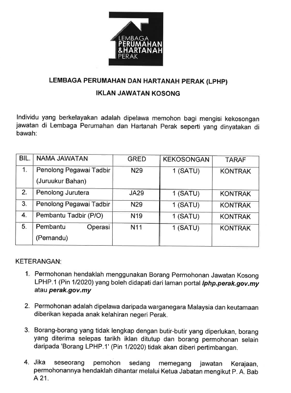 Jawatan Kosong Lembaga Perumahan Hartanah Perak Lphp Tarikh Tutup 14 Februari 2020