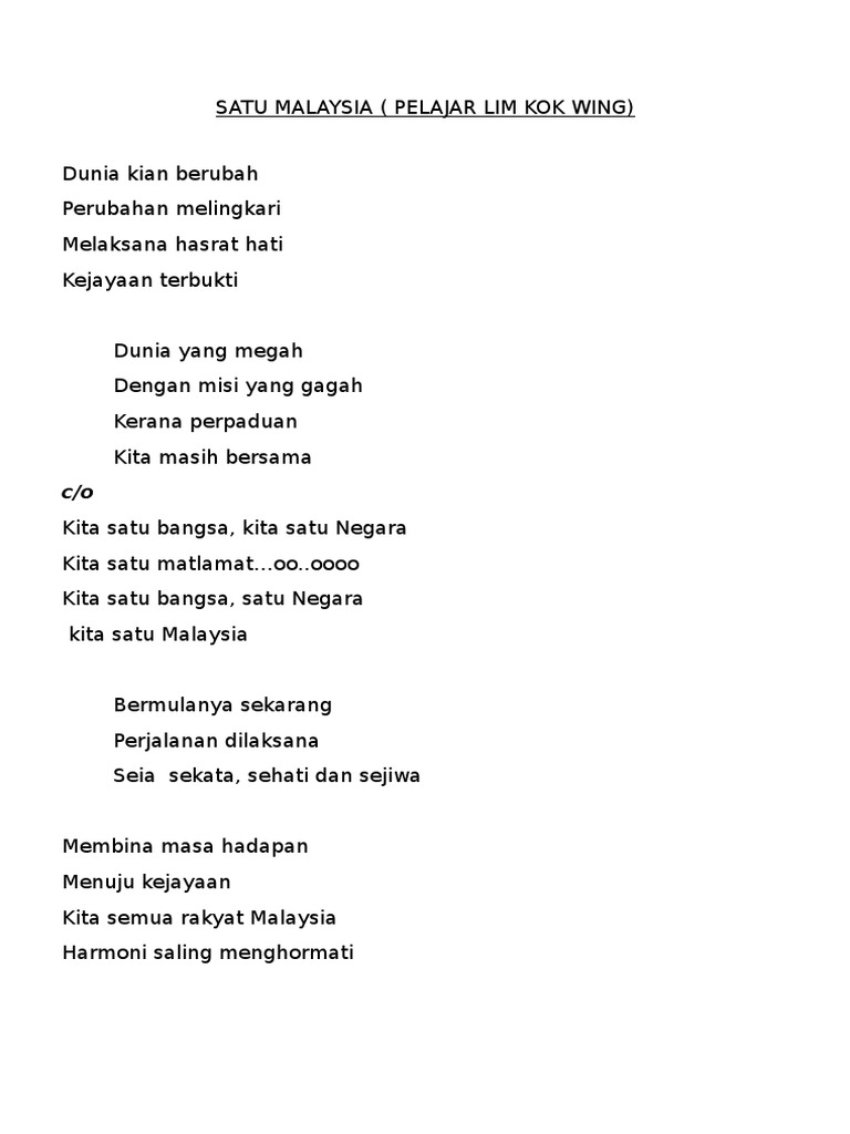 Lirik Satu Malaysia Lim Kok Wing Docx