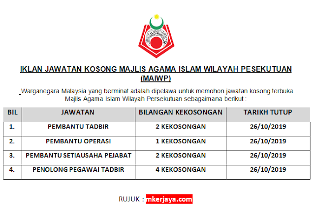 Majlis Agama Islam Wilayah Persekutuan Maiwp Membuka Pelbagai Jawatan Kosong Sehingga Tarikh Tutup Permohonan 26 Oktober 2019 Malaysia Kerjaya