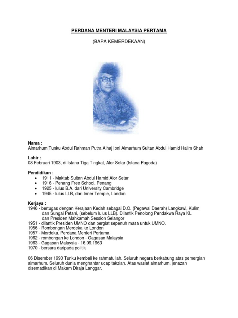 Maklumat Tentang Perdana Menteri Malaysia Yang Pertama
