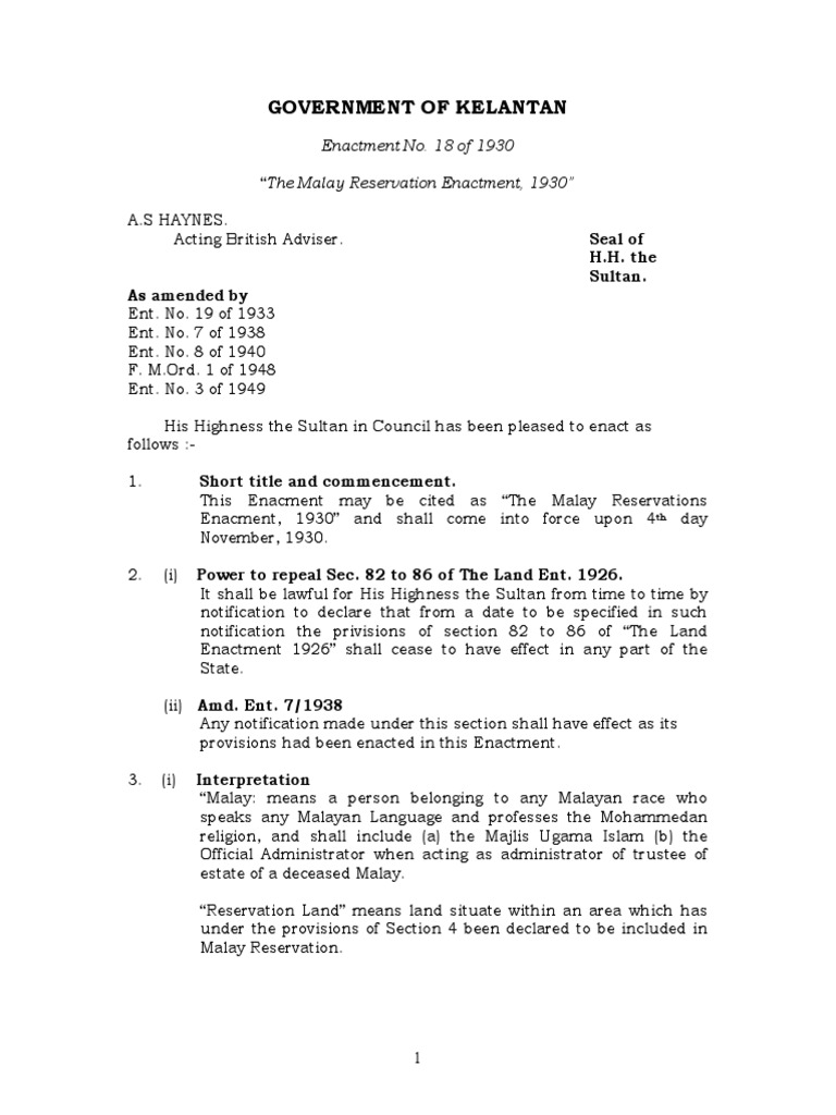 Unit 6 Malay Reservations The Malay Reserve Enactment F M S Cap 142 Malaysia Government Information