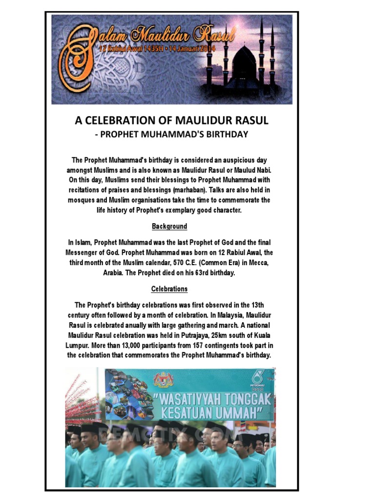 Maulidur rasul is celebrated to commemorate. What is known is that islam came to brunei in the 11th or 12th century and was entrenched further when the first brunei sultan sultan muhammad shah converted to islam when he married a johore princess in 1363. This year s maulidur rasul in observance of the birthday of prophet muhammad is celebrated nationwide with programmes to exult love for the prophet. It is a significant event in the islamic calendar as it s the celebration of prophet muhammad s birthday. Commemorating maulidur rasul muslims need to learn and commemorate maulidur rasul and the struggle endured by prophet muhammad peace be upon him in upholding the islamic law.