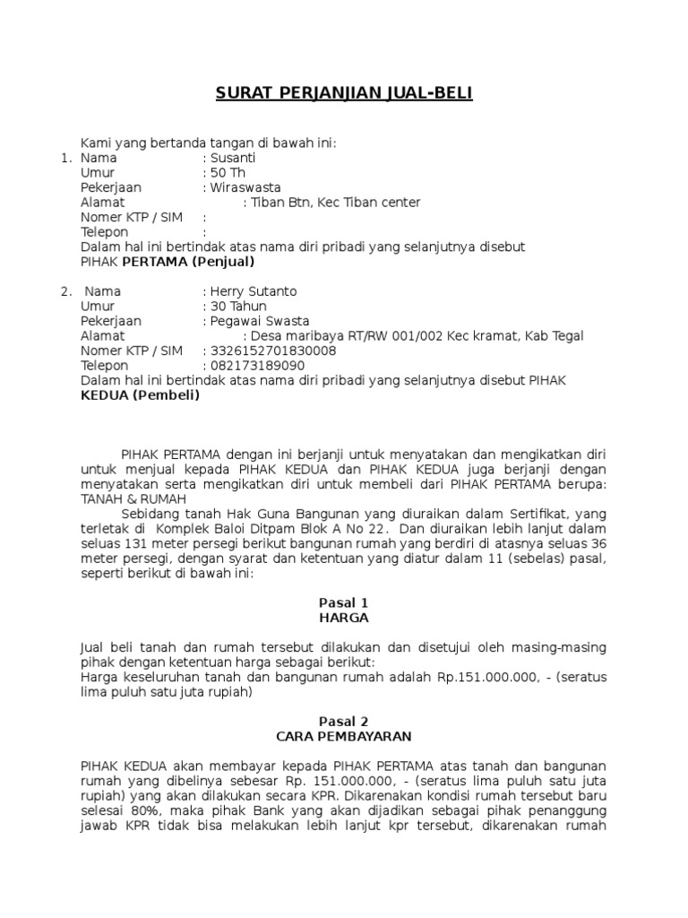 Surat Perjanjian Jual Beli Rumah Beserta Pasal Pasalnya Sipeti Co Id
