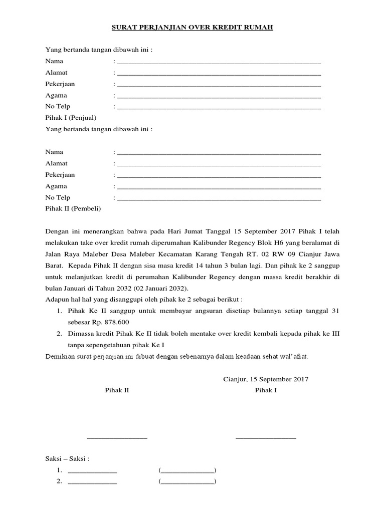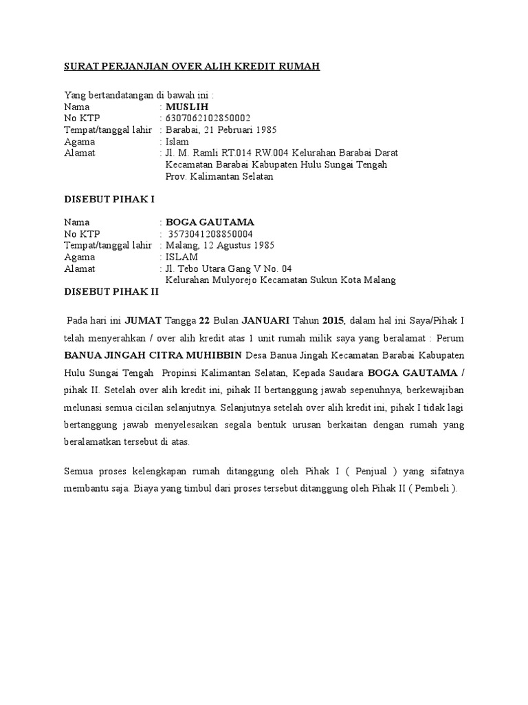 Pdf Contoh Surat Perjanjian Over Alih Kredit Rumah Blackwell Masli Academia Edu