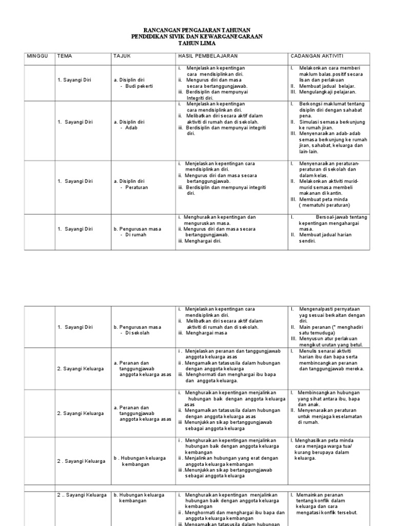 Rancangan Pengajaran Tahunan Pendidikan Sivik Dan Kewarganegaraan Tahun Lima
