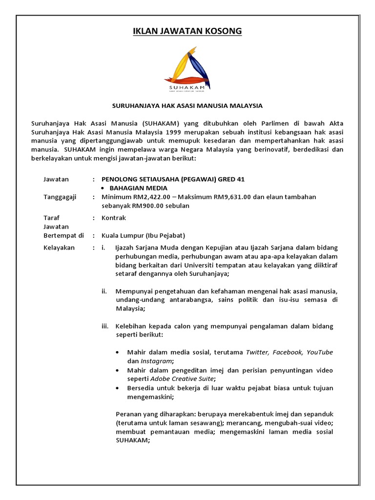Jawatan Kosong Suruhanjaya Hak Asasi Manusia Malaysia Suhakam 01 Ogos 2018 Job Jawatan Kosong