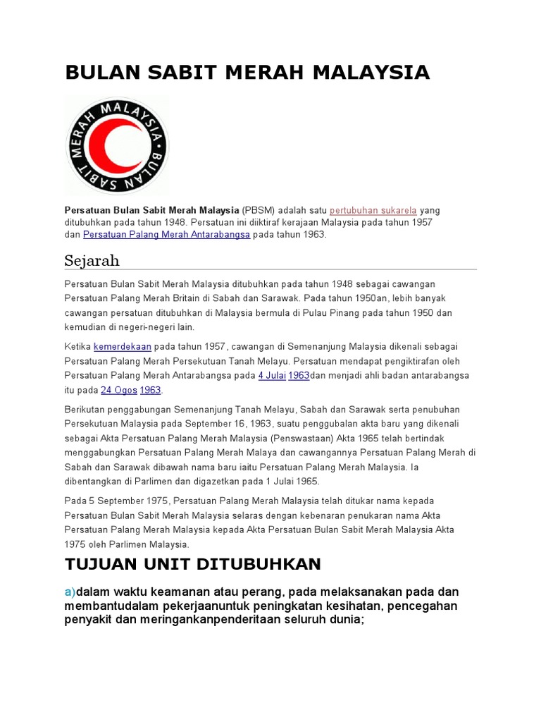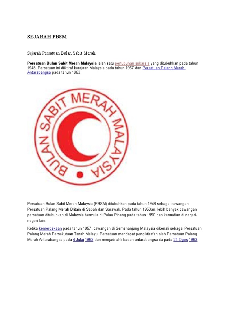 Persatuan bulan sabit merah malaysia pbsm ditubuhkan pada tahun. Persatuan bulan sabit merah malaysia ditubuhkan pada tahun 1948 sebagai cawangan persatuan palang merah britain di sabah dan sarawak. Persatuan bulan sabit merah malaysia pbsm ditubuhkan pada tahun 1948 sebagai cawangan persatuan palang merah britain di sabah dan sarawak. Persatuan bulan sabit merah malaysia pbsm ditubuhkan pada tahun 1948 sebagai cawangan persatuan palang merah britain di sabah dan sarawak. Pada tahun 1950an lebih banyak cawangan persatuan ditubuhkan di malaysia bermula di pulau pinang pada tahun 1950 dan kemudian di negeri negeri lain.