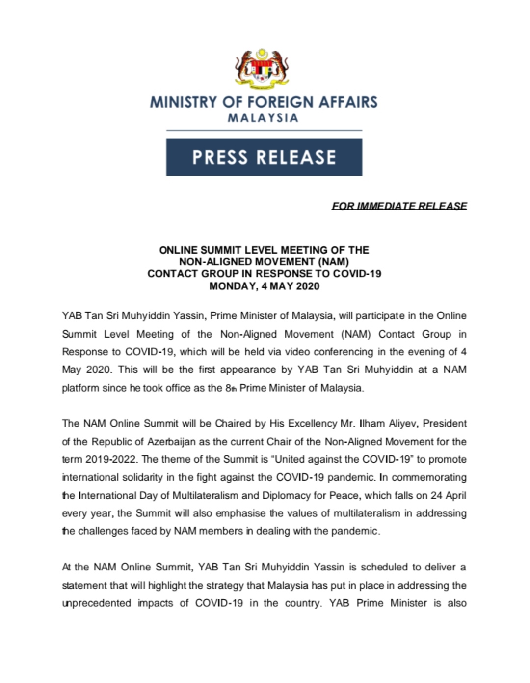 Wisma Putra On Twitter Press Release Pm Tan Sri Muhyiddinyassin Will Make His Inaugural Appearance At The Nam Online Summit Level Meeting Later Today Pm Is Expected To Highlight The Strategy That